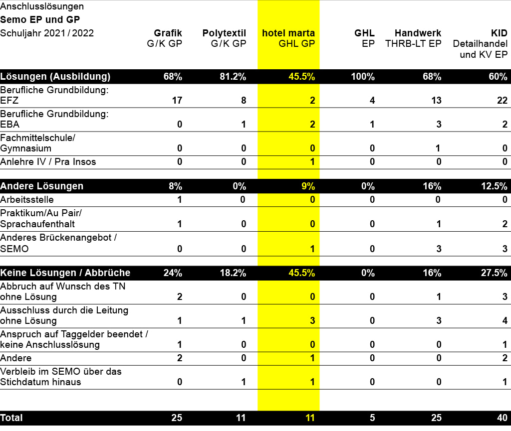 Fünf TN verliessen das GP mit einer Lehrstelle bzw. PrA-Stelle, wobei vier Teilnehmerinnen in programmnahen Branchen starteten: