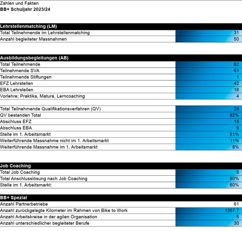 Bei den Ausbildungsbegleitungen konnten wir zahlreiche Jugendliche und junge Erwachsene durch ein erfolgreiches Qualifikationsverfahren (QV) zum Abschluss der Lehre begleiten. Diese jugendlichen Teilnehmenden haben während ihrer Ausbildung und während des Coachings teilweise sehr bemerkenswerte Fortschritte gemacht. Einige dieser Erfolgsgeschichten sind in Form von Interviews im Jahresbericht dokumentiert.
