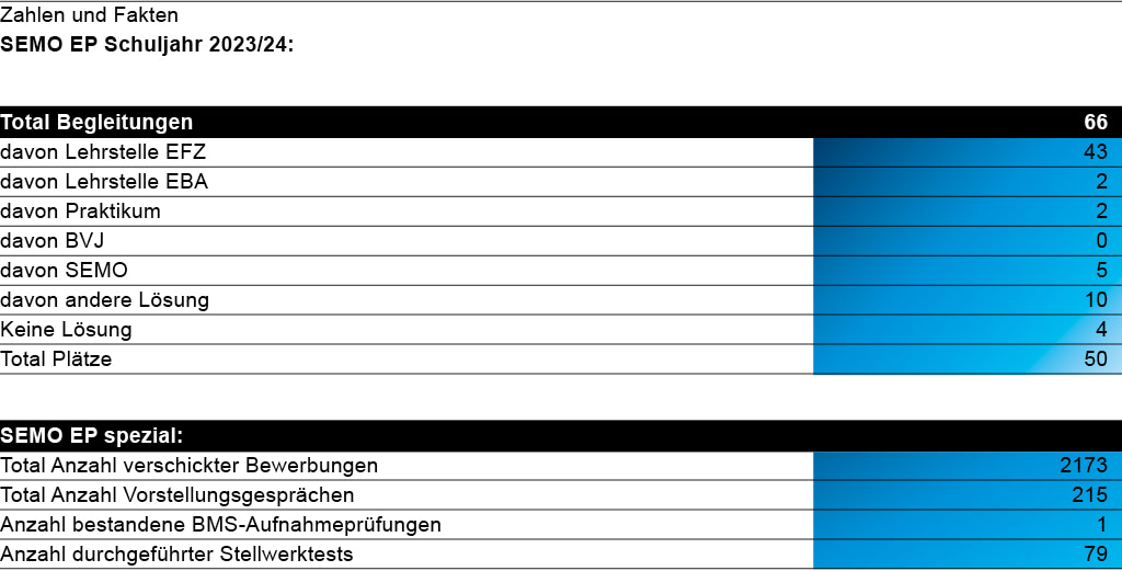 Wir möchten an dieser Stelle auch den Verantwortlichen in den Praktikumsbetrieben danken. Ihr Engagement für die Berufsintegration unserer Teilnehmenden ist für uns wertvoll. Ebenso gilt unser Dank den RAV-Beratenden und den Fachpersonen weiterer involvierter Stellen, die durch ihre hervorragende Zusammenarbeit und ihr Vertrauen massgeblich zum Erfolg unserer Teilnehmenden beitragen haben. Ein besonderes Dankeschön gilt den Mitarbeitenden des SEMO EP. Durch ihren unermüdlichen Einsatz und ihre Ausdauer haben sie unsere Teilnehmenden auf ihrem Weg in eine Ausbildung erfolgreich begleitet.